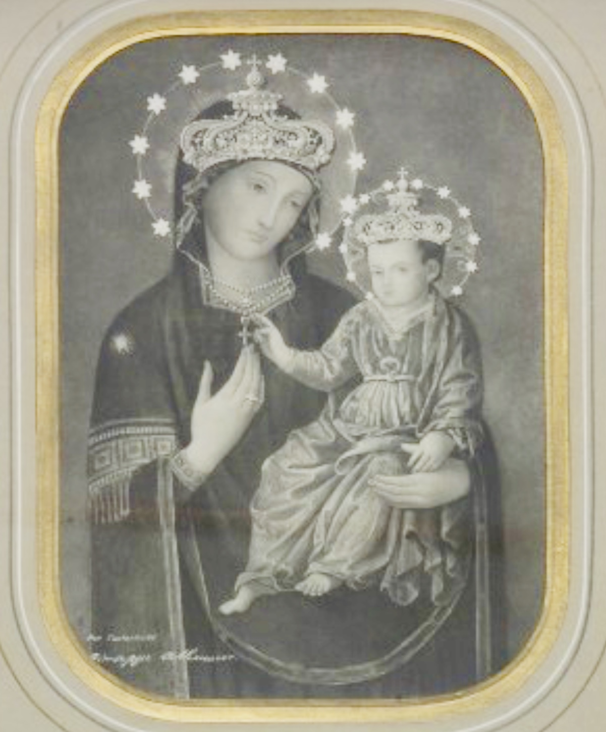 Corona di dodici stelle intorno al capo di Maria. È un attributo dell’Immacolata, già presente in riproduzioni della Vergine Consolata.