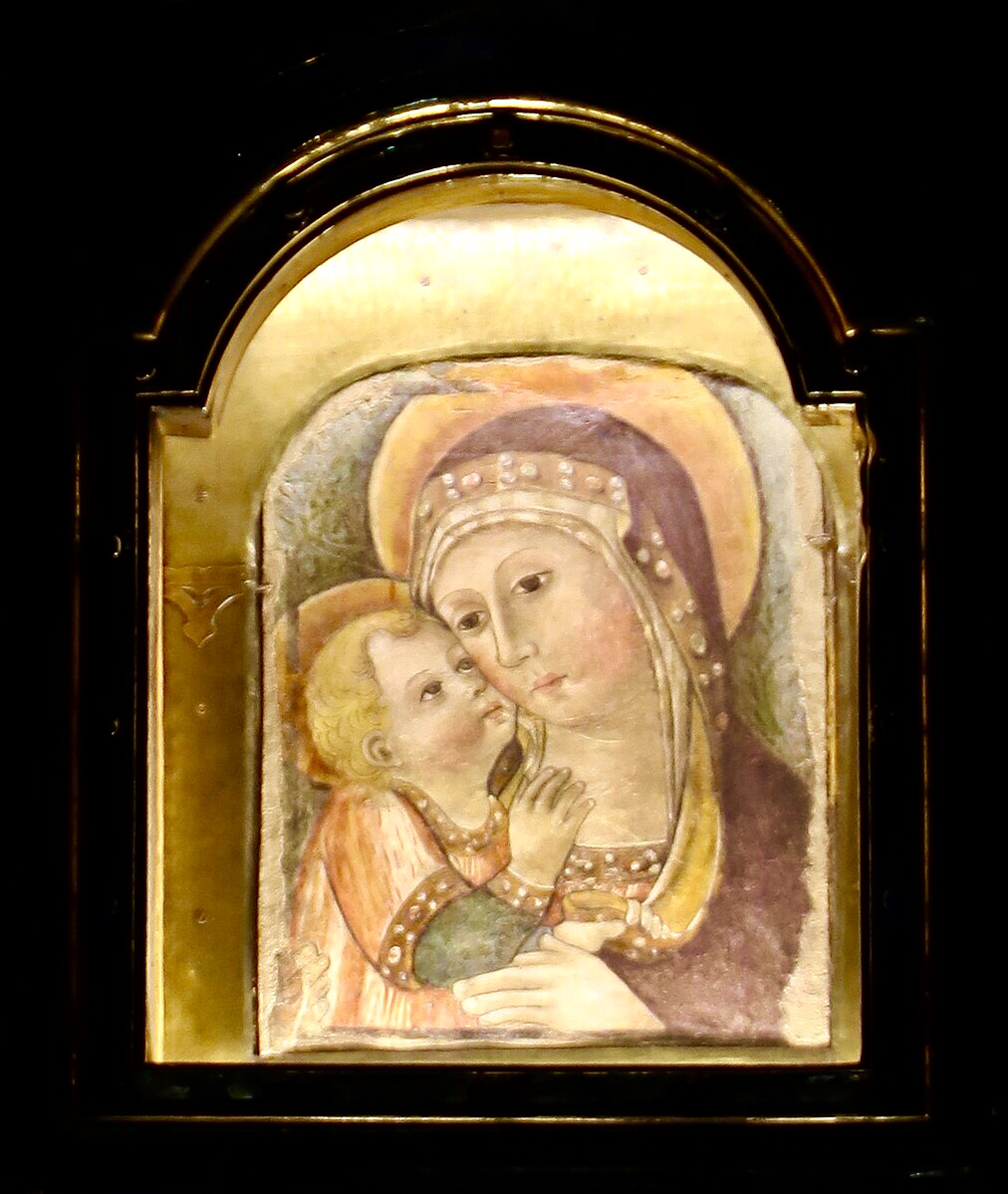 Postura di Maria. È frontale, con il capo inclinato verso il Figlio, lo sguardo rivolto verso il basso, verso il fedele. L’espressione è mesta ed esprime la sua consapevolezza della Passione, nel ricordo delle parole rivolte le dal vecchio Zaccaria: “E anche a te una spada trafiggerà l’anima” (Vangelo di Luca, 2, 35). Abbraccia Gesù e contemporaneamente lo indica con la mano sinistra.