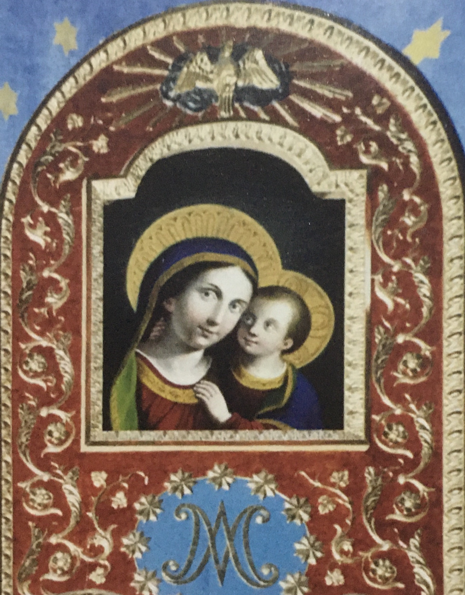 Postura di Maria. È di tre quarti, con il volto abbassato verso il Figlio, la guancia accostata alla sua. Gli occhi, nel quadro di Sarullo, sono abbassati; nella riproduzione di Minima Devotio sono aperti e guardano l’infinito. Sembra in ascolto di quanto le comunica Gesù. Secondo la tradizione, infatti, questo modello coglie il momento in cui il Figlio rivela alla Madre il mistero della sua Passione. L’espressione è mesta, in maniera più accentuata nella tela di Minima Devotio.