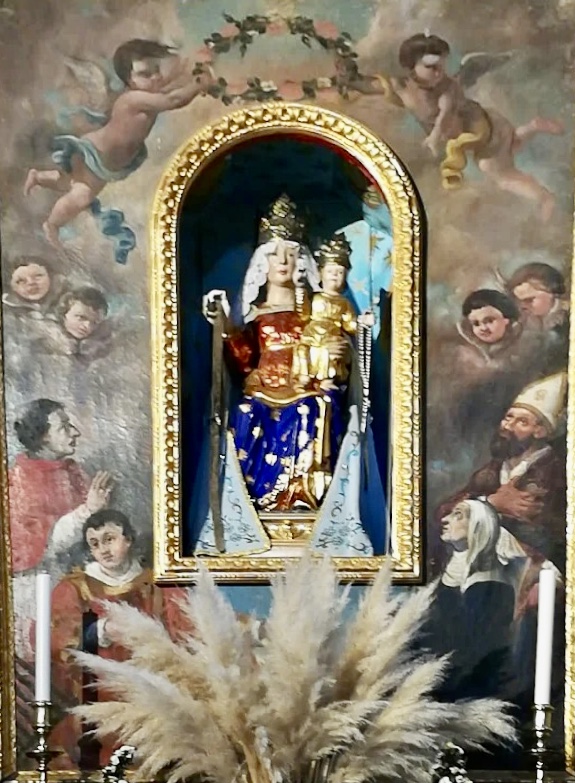 specificità sono superate a favore di un unico atteggiamento religioso: un affidamento confidente, nell’attesa certa di protezione ed aiuto. La nicchia in cui si trova la statua è inserita all’interno di una pala d’altare che presenta, a destra, Santa Monica, inginocchiata, in abiti agostiniani, che regge la cintura donatale dalla Madonna. Dietro di lei il figlio, Sant’Agostino, indossa