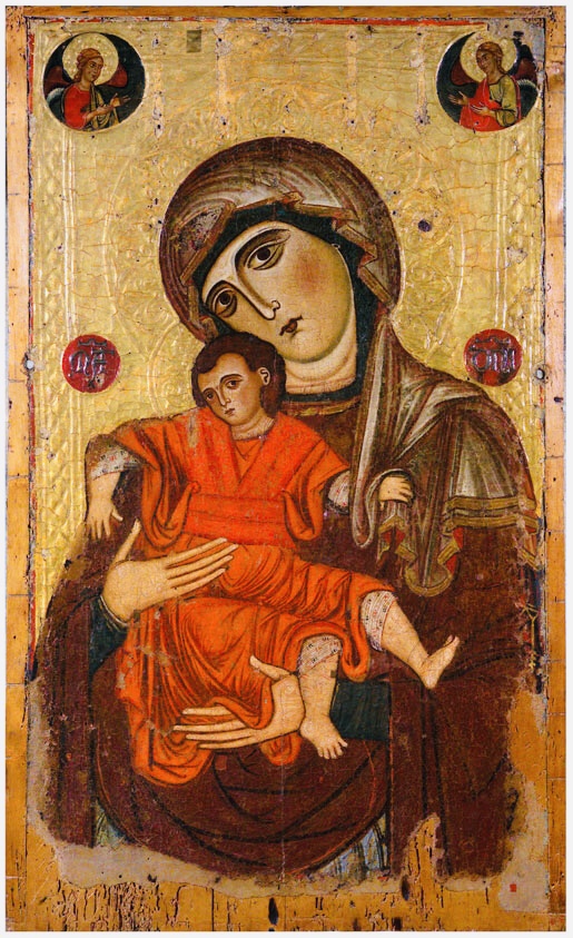 Le scritte. Sopra le spalle del Bambino e della Madre ci sono due decorazioni rosse a pastiglia probabilmente aggiunte dopo, che riportano l’acronimo che sta per “Meter theou”= Madre di Dio: Mr a sinistra e Oni a destra.