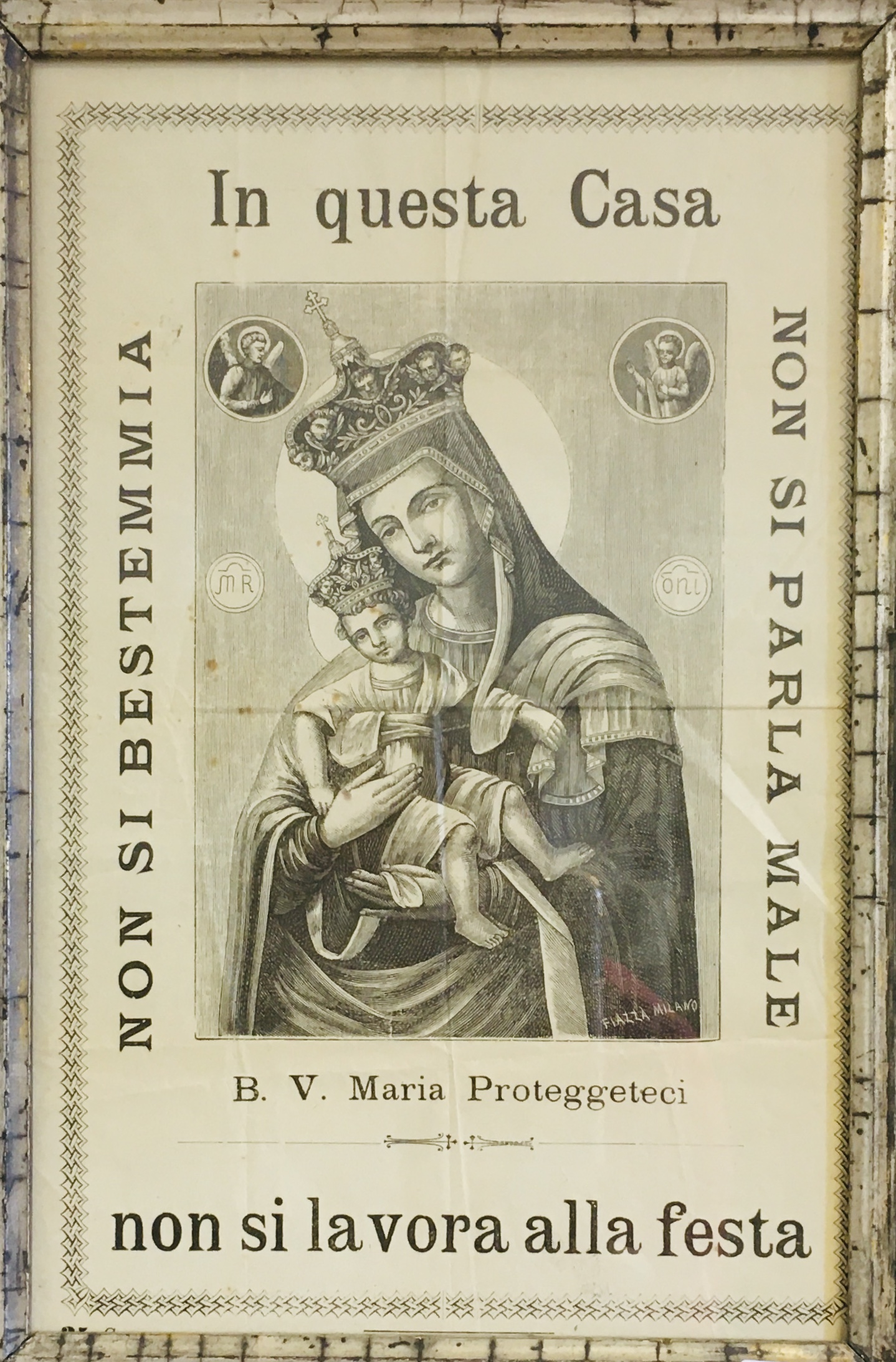 I visitatori di Minima Devotio sono accolti da una stampa che recita: “In questa casa non si bestemmia, non si parla male, non si lavora alla festa” concludendo con l’invocazione “B. V. Maria proteggeteci”. Incorniciata da queste parole veglia l’immagine di una Madonna abituata più ai campi di battaglia che ai focolari domestici: quella della Madonna delle Vittorie di Piazza Armerina, in Sicilia, appartenente al modello di cui stiamo parlando.